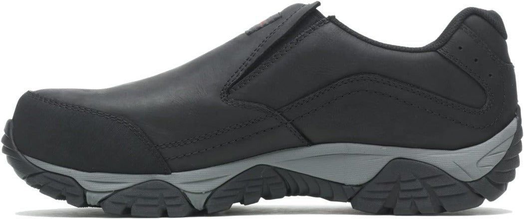 Style your look and stay protected in the Merrell J004639 Men’s Moab Adventure Moc CF Hiking Shoe. This slip-on, work-ready moc pairs a classic clog silhouette with a carbon composite safety toe, breathable comfort, and reliable slip resistance. A leather upper, cushioned PU foam insole, and EVA midsole help keep you comfortable on your feet, while EH protection and an ASTM F2913-19 slip-resistant outsole deliver confidence on varied surfaces.