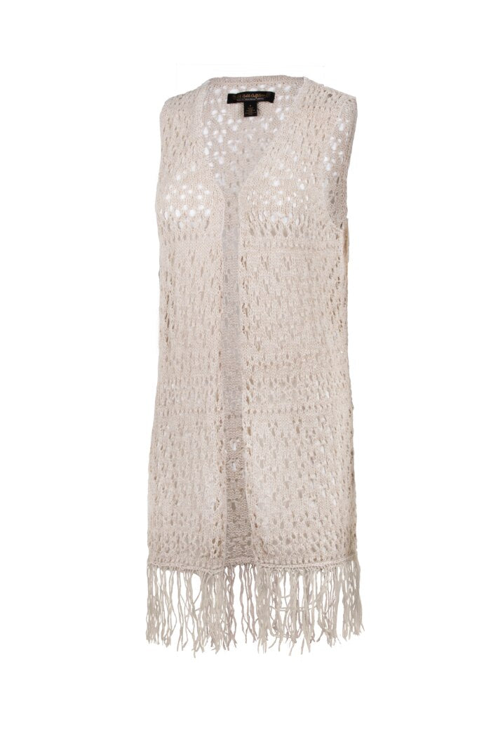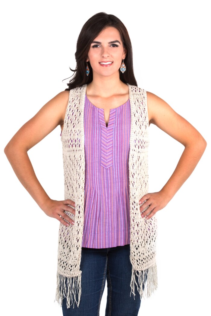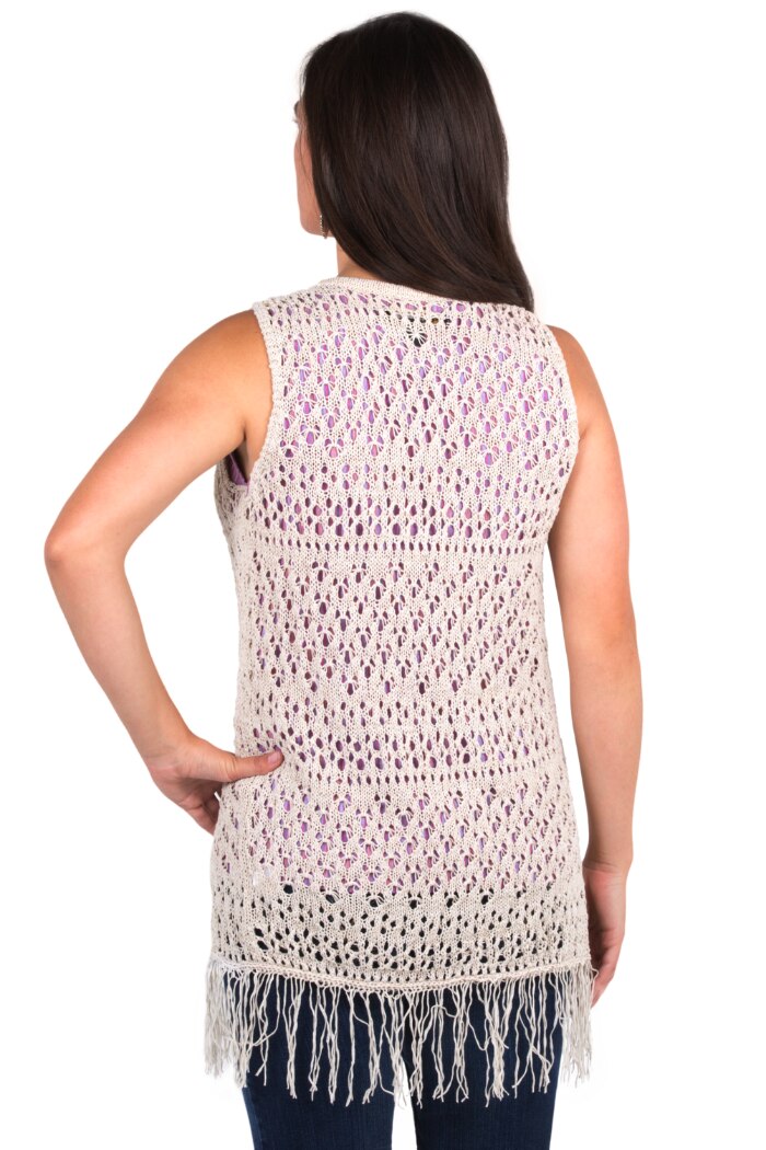 The Noble Outfitters Arizona Knit Vest will make quite a fashion statement! This stylish, loose fitting vest is designed with flattering pointelle stitch with a fringe hem. Hand wash. Materials: 55% Cotton, 45% Polyester, tape yarn.