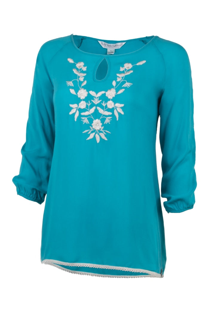 The Noble Equestrian Ladies Jolene Peasant Top is a lovely shirt designed with a loose fit, attractive embroidery, as well as lace detailing on the sleeves and hem. Further features include stretch elastic sleeves and split sleeve detailing. Machine wash. Softly washed 100% Rayon.