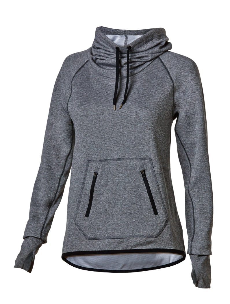 Stylish and versatile layer of warmth without the bulk. Warmth in a fashionable pullover style Funnel neck features a drawstring closure cowl neck. Kangaroo front pockets with YKK zipper closure. Flat seam construction and dropped back hem. Opti-Dri technology and fashionable thumb hole at cuff