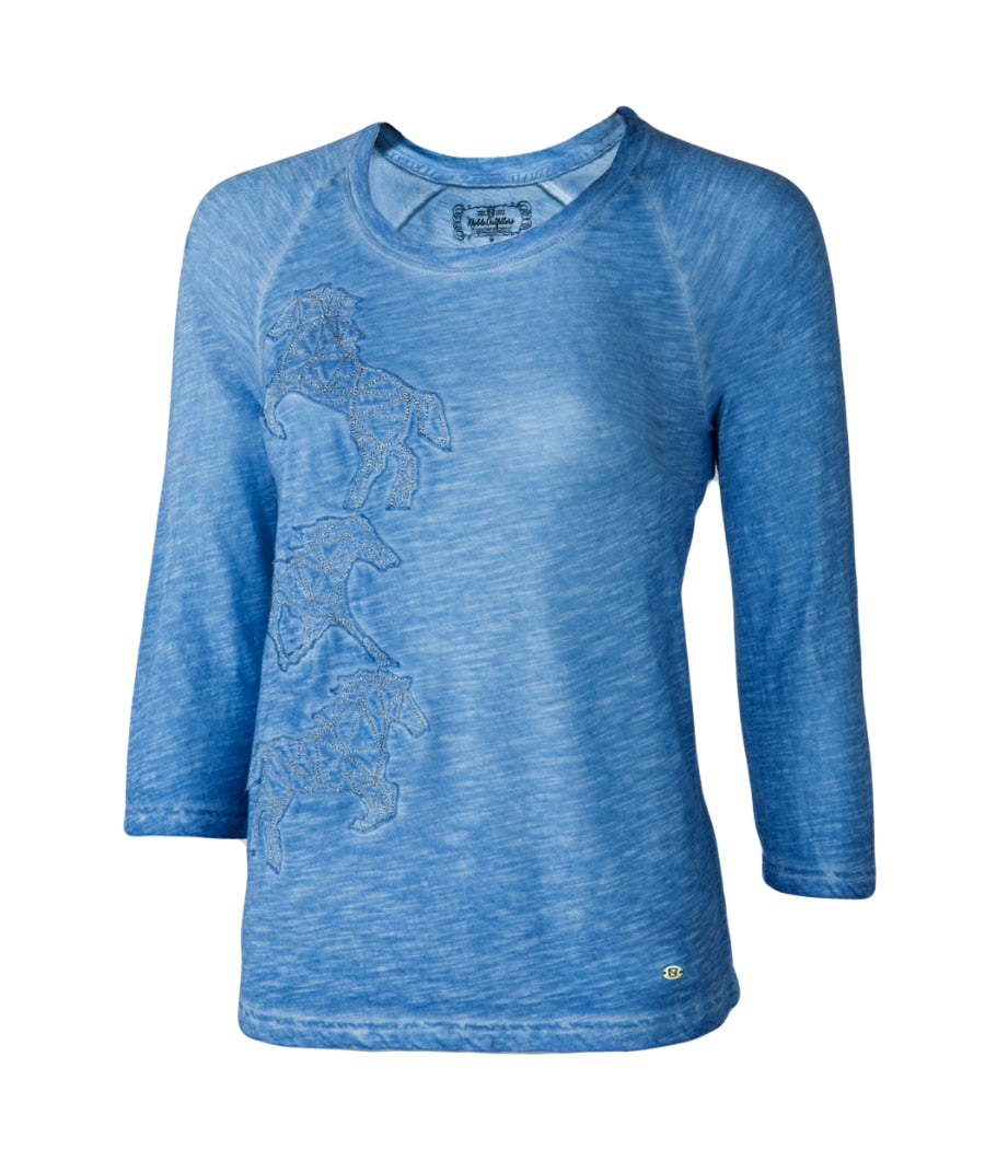 Be unique in the Noble Outfitters Washed Horses T-Shirt. Each 3/4 length raglan sleeve shirt is unique, handcrafted with a special spray print technique and overlay embroidery featuring metallic stitch detail. Machine wash and lay flat to dry.