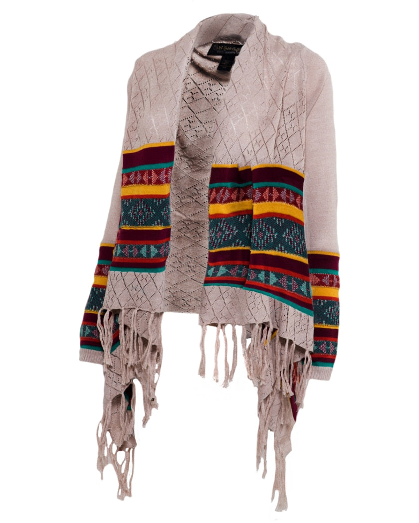 Slouchy and light, the Noble Outfitters™ Frontier Fringe Cardigan is destined to be your go-to piece this season. Made from a fine gauge pointelle knit with fringe detailing, this cozy open front cardigan features a vibrant Aztec pattern. Hand wash only.