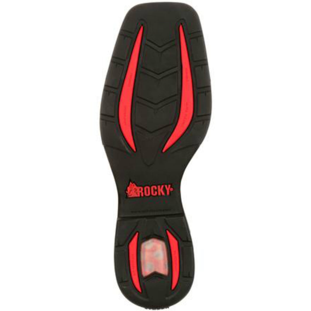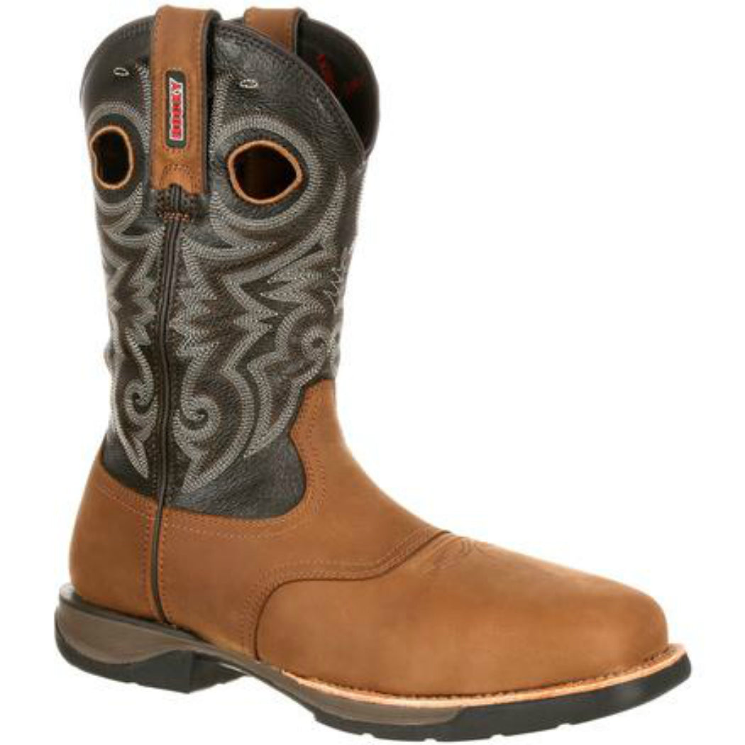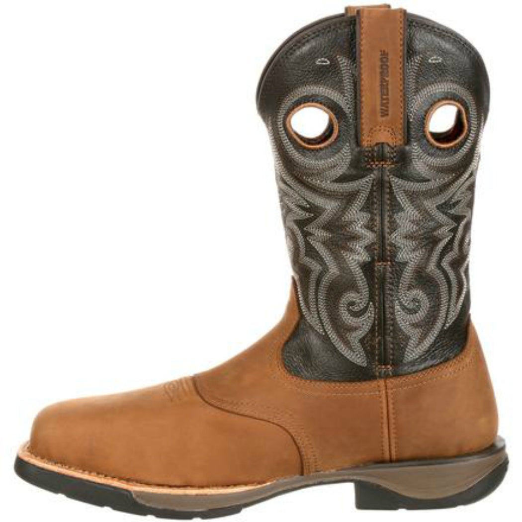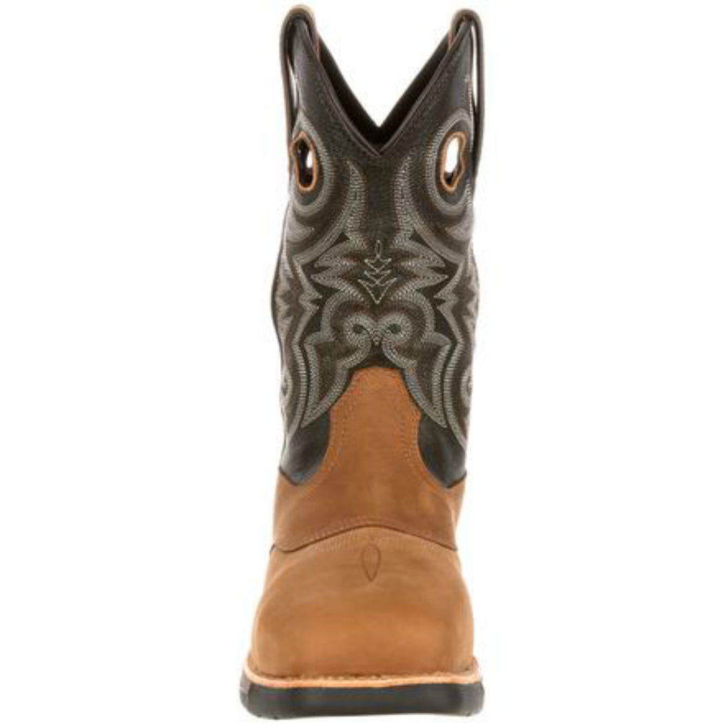 This work boot doesn't weigh you down. The Rocky® LT Composite Toe Waterproof Saddle Western Boot is 31 percent lighter than traditional composite toe western boots. This great western work boot is full-grain leather. White stitching details the chocolate brown shaft. Pull straps and pull holes at the top match the light brown foot and are practical because they help you get into your cowboy boot. Another feature that makes it really easy to get into your western work boot is the Expansion Fit Seam™. Side seams stretch then return to their shape for a great fit. This men's brown cowboy boot has a hard-working design. You get a composite toe that protects your toes from falling objects, and the safety toe meets ASTM standards. It's also is an electrical hazard-resistant boot, serving as a secondary method for reducing your risk of electric shock. Your feet stay dry on and off the job in this waterproof boot. It has guaranteed Rocky Waterproof construction. The outsole is a dual-density rubber outsole with an EVA Honeycomb midsole. This combination gives you traction and a comfortable base. Extra comfort comes from the Flex Facilitator insole for flexible comfort. This is matched with a ventilated, removable dual-density EVA cushion footbed. This footbed has extra cushioning and allows air to get to your foot. A soft mesh lining lets air get to your foot while the fiberglass shank gives you arch support. This comfortable composite toe work boot is 11 inches tall. It's made with a durable double-row leather welt stitch that extends the life of your boot.